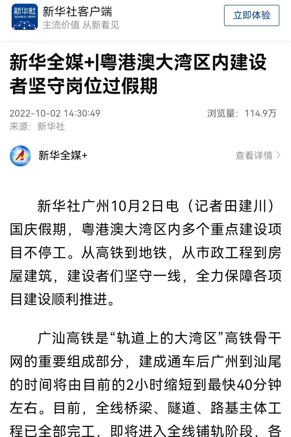 10月2日,新华社新华全媒+刊文《粤港澳大湾区内建设者坚守岗位过假期》,报道中建三局建设者们坚守一线,全力保障各项目建设顺利推进,为粤港澳大湾区建设贡献力量。