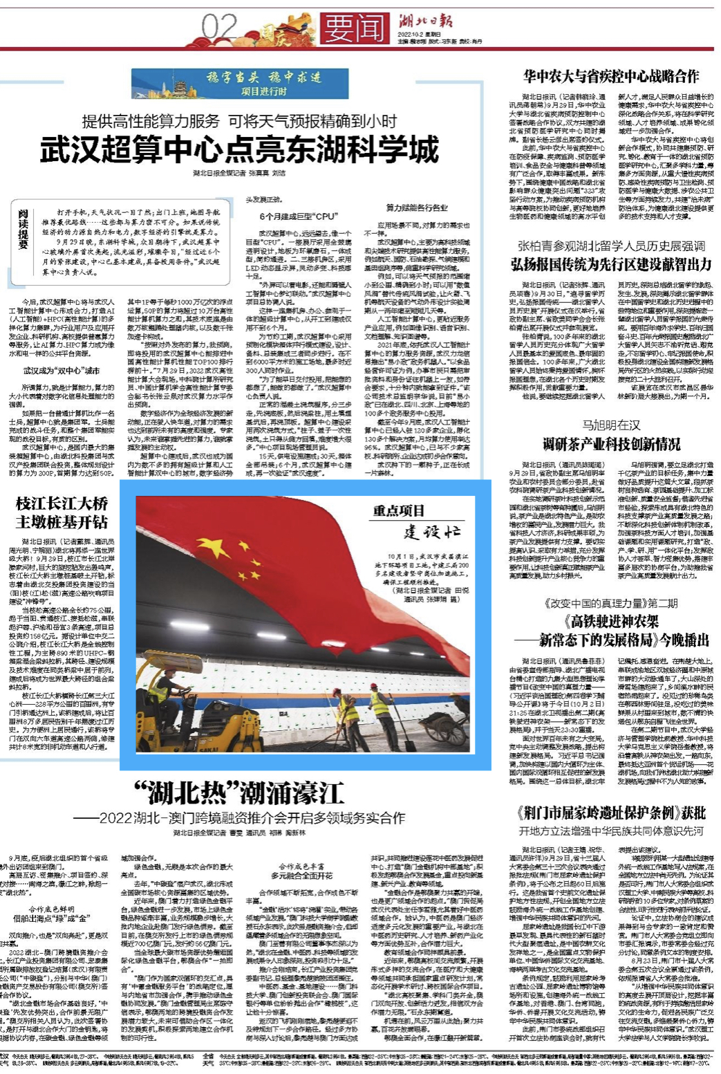 10月2日,湖北日报要闻版刊发《重点项目建设忙》,报道10月1日国庆当天,武汉市武昌滨江地下环路项目工地,中建三局200多名建设者坚守岗位加速施工,确保工程顺利推进。