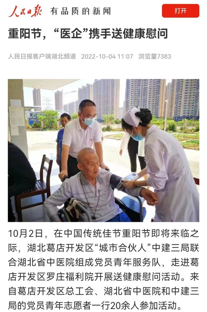 10月4日,人民日报客户端刊文《重阳节,“医企”携手送健康慰问》,报道在中国传统佳节重阳节即将来临之际,湖北葛店开发区“城市合伙人”中建三局联合湖北省中医院组成党员青年服务队,走进葛店开发区罗庄福利院开展送健康慰问活动。