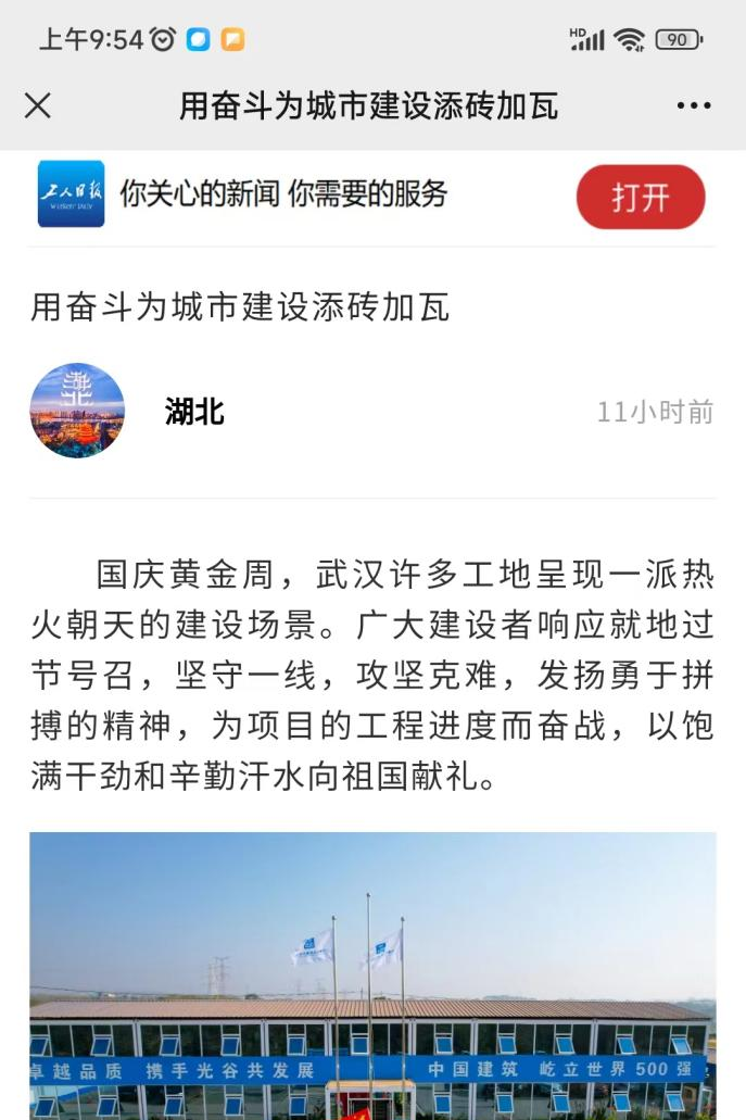 10月1日,工人日报客户端刊文《用奋斗为城市建设添砖加瓦》,报道中建三局桥梁事业部光谷科学岛和青菱电网项目建设者坚守岗位为国庆献礼,展现项目大干快上的施工氛围。