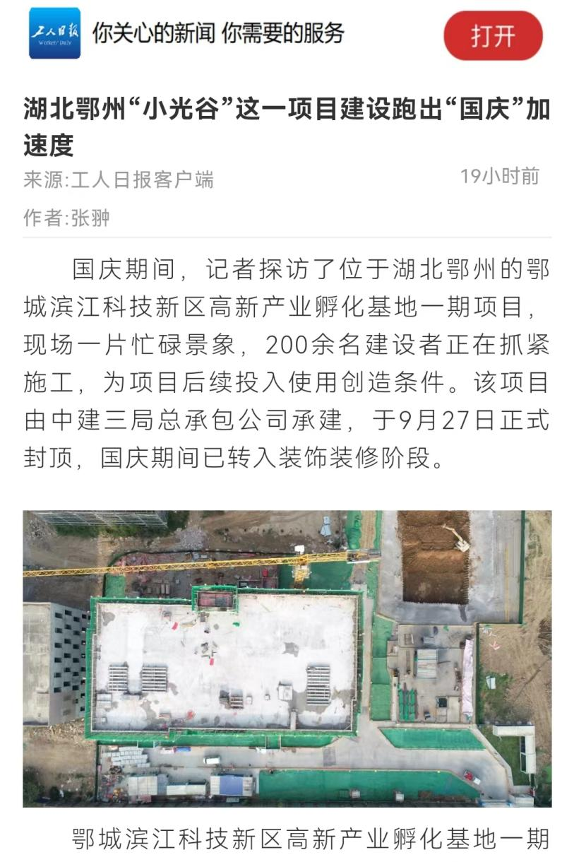 10月1日,工人日报客户端刊文《湖北鄂州“小光谷”这一项目建设跑出“国庆”加速度》,报道国庆期间,在位于湖北鄂州的中建三局总承包公司承建的鄂城滨江科技新区高新产业孵化基地一期项目,现场一片忙碌景象,200余名建设者正在抓紧施工,为项目后续投入使用创造条件。