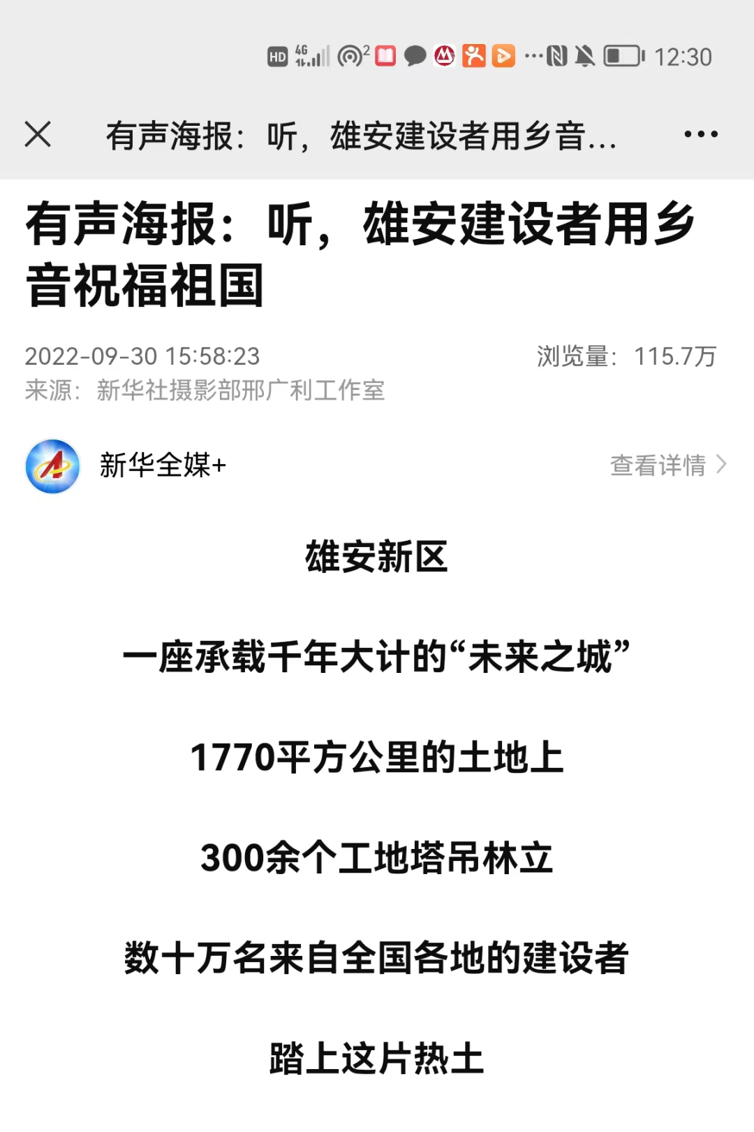 9月30日,新华社刊发《有声海报:听,雄安建设者用乡音祝福祖国》,报道来自中建三局等单位的数十万名来自全国各地的建设者,扎根在雄安,拼搏在雄安,为这座拔节生长的新城添砖加瓦,用乡音对祖国的美好祝愿。