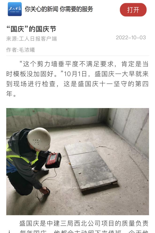 10月3日,工人日报客户端刊文《“国庆”的国庆节》,报道中建三局西北公司项目质量负责人盛国庆4年坚守,既是对自己工作的负责,也是以另一种方式为祖国庆生。讲述盛国庆作为质量员的故事。