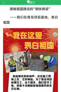 10月1日,中国青年网刊文《中国人的故事|我在这里,表白祖国》,报道中建三局一公司京东方物联网移动显示端口器件青岛生产基地项目的建设者,这个国庆坚守工地,把奋斗当做献给祖国最好的生日礼物,用奋斗向祖国真情表白!