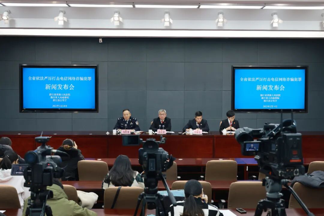 2022年2月14日,浙江省高级人民法院联合省检察院、省公安厅召开新闻发布会,通报全省打击电信网络诈骗犯罪情况,更好地发挥司法引领作用,引导全民增强防诈反诈意识。据审判数据统计,2019年1月至2021年12月,全省法院共受理电信网络诈骗犯罪一审案件6568件,审结6437件,共判决被告人19322人,依法从严打击电信网络诈骗犯罪及上下游关联犯罪,切实维护人民群众合法权益,有力保障市场经济秩序。