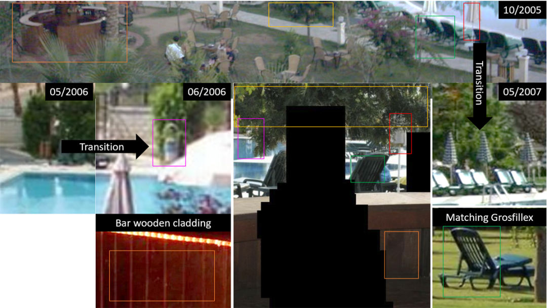 分析图片BB001,在一个绿色躺椅旁边的小桌子上有一个绿松石的东西。令人惊讶的是,在调查不同的酒店图片时,我们注意到在离泳池区很近的地板上有一个绿松石色的袋子,与BB001中看到的物体相符。有这个袋子的照片的日期被详细说明为2006年7月。