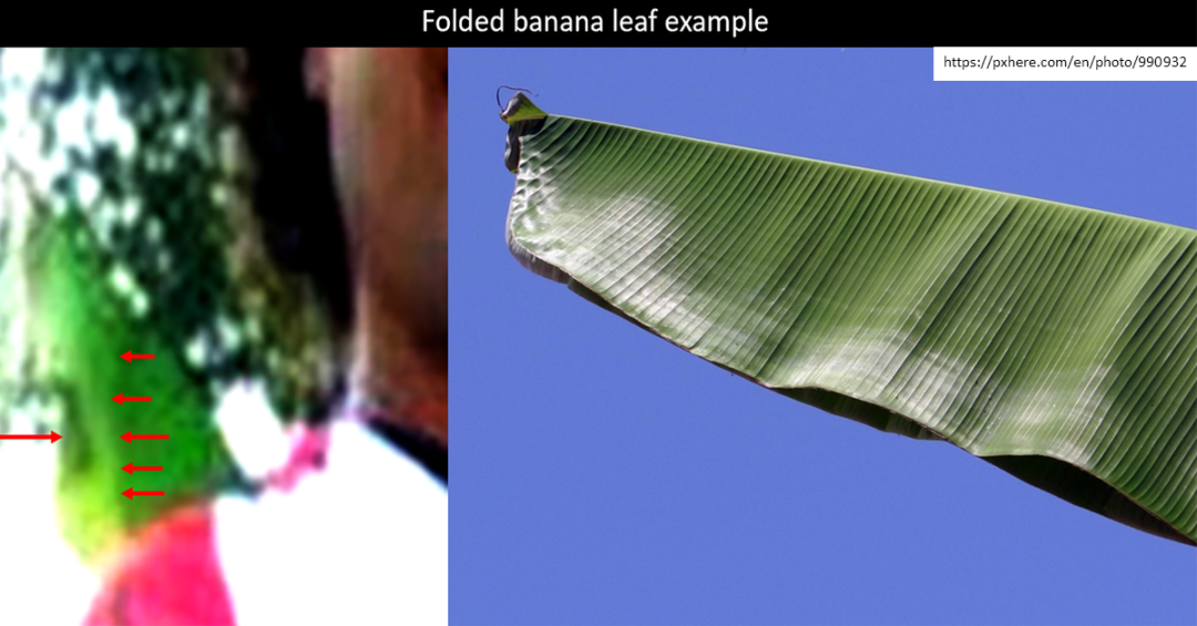 我们观察到无名氏29号身后的一片绿叶的特殊形状。通过选择一些例子,我们确定有关的折叠叶子很可能是在强光下的香蕉叶。