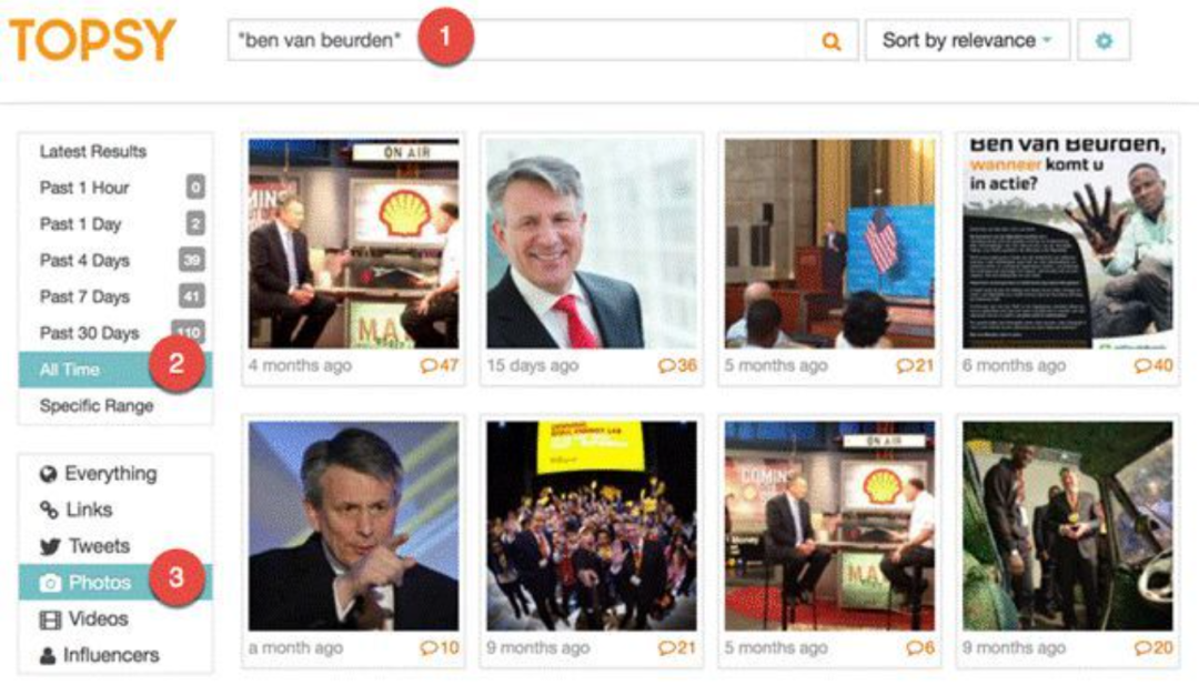 可以使用 http://topsy.thisisthebrigade.com 来找出主题在哪里,通过分析他的提及(1)随时间推移(2)并查看其他人在Twitter上发布的照片(3)如果想研究特定时期,请在时间菜单中选择“特定范围”。