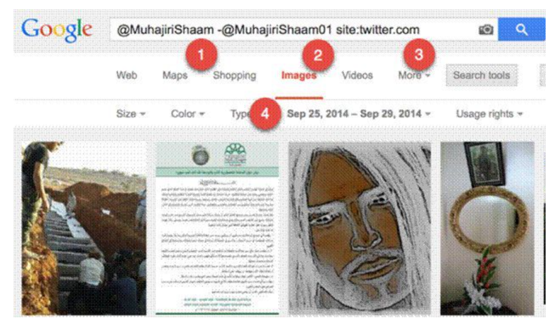 对你的主题的所有了解结合在一个强大的短语中。在下面的示例中,我正在搜索一个名为 @MuhajiriShaam (1),而不是 Twitter (3) 上的帐户@MuhajiriShaam01 (2)。我只想看看他在2014年9月25日至9月29日期间在Twitter上发布的照片(4)。
