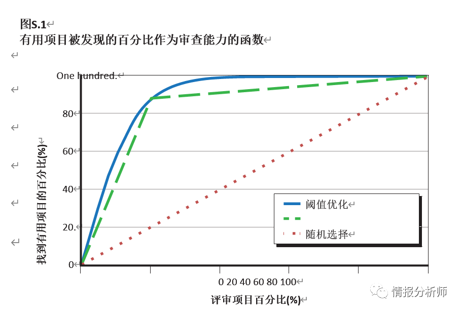 注意: 在这个模型中,信息优先级系统将所有项目标记为有用或无用,然后分析人员检查已经到达的项目的固定百分比,显示在x轴上。 固定阈值对应于具有任意选择阈值的单个可能系统。 阈值优化曲线上的每一个点都代表了该审查百分比所优化的系统的性能。更多细节见第三章。
