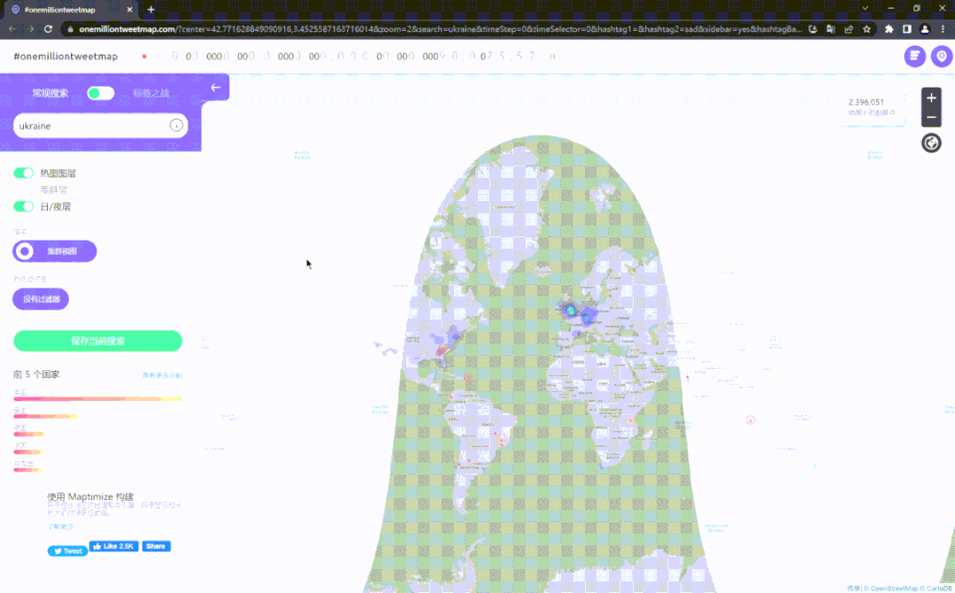如图在搜索处输入Ukraine,地图就可以显示24小时内全球关于该关键词推文的状况
