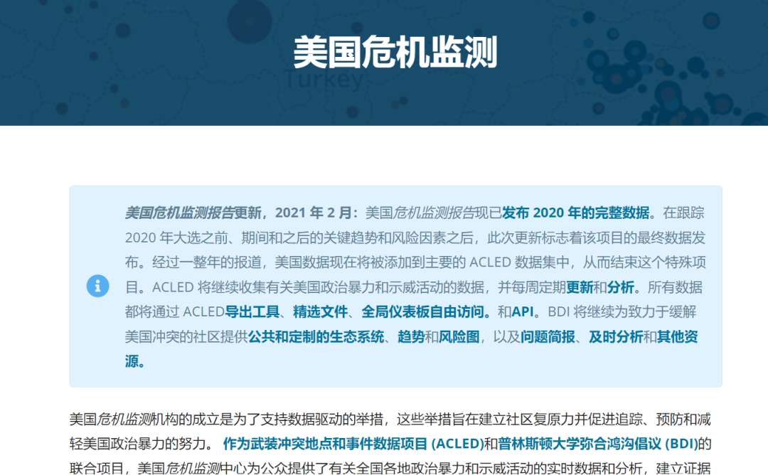 US Crisis Monitor 最初是武装冲突地点和事件数据项目 (ACLED) 和 BDI 之间的一个联合项目,旨在为公众提供有关美国各地示威和政治暴力的实时数据和分析。