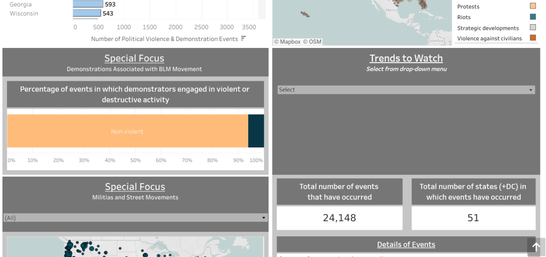 美国危机监测仪表板绘制了有关政治暴力、示威和战略发展的最新数据,并允许用户跟踪其他值得关注的趋势,包括:对示威者使用国家武力、国家针对记者、反抗议、汽车撞击攻击针对示威者、武装人员在示威中的存在、与 COVID-19 大流行相关的事件以及与“计数每票”和“停止偷窃”运动相关的选举后示威。