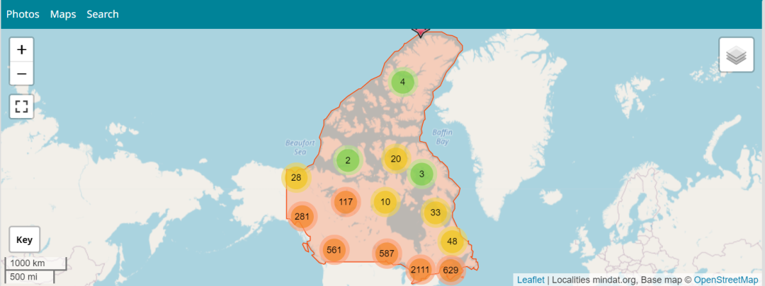那些粉红色的有一个已知的纬度和经度。陨石使用不同的图标。如果我们正在查看单个位置,这些位置将显示为红色,而其他位置将显示为灰色。如果我们正在查看一个地区,所有下属地区都将显示为红色。