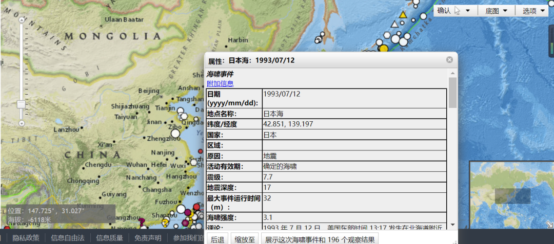 左侧工具栏可以对具体灾害进行选定查询,也可以在右侧世界地图中直接对某些地区的灾害进行点击查询,例如·对日本海某区域进行查询: