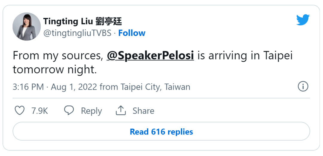 当地网络TVBS的一名记者在推特上表示,该发言人预计将于周二晚上抵达台湾。