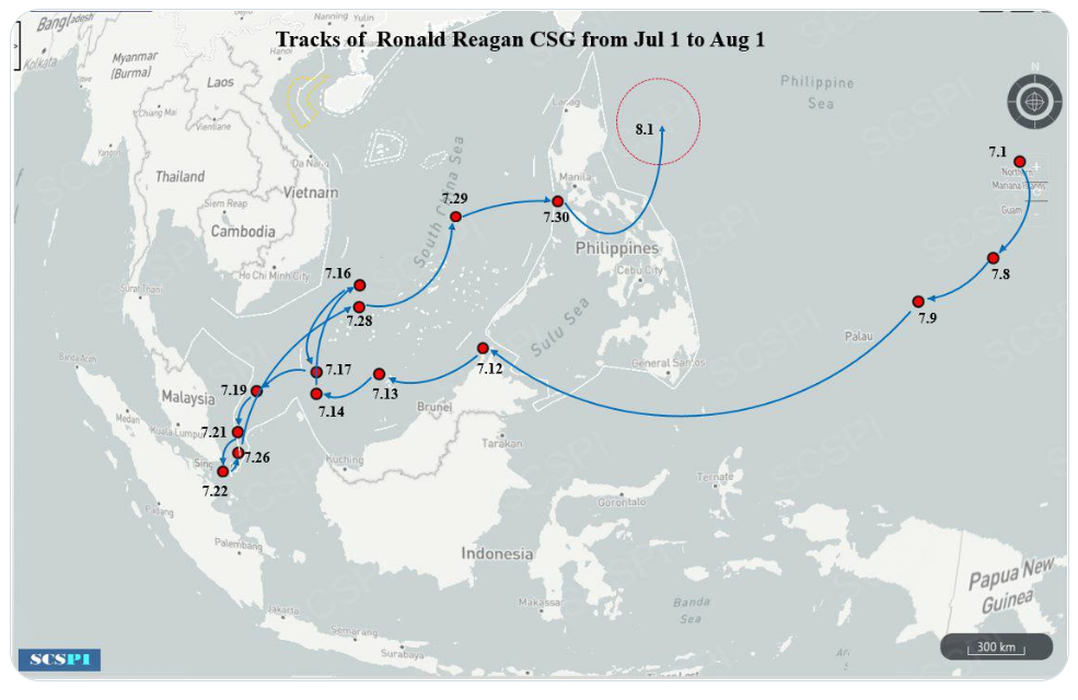 美国海军航空母舰罗纳德·里根号(CVN-76)正在接近Taiwan以东的水域。7月1日到8月1日的整个航行轨道。