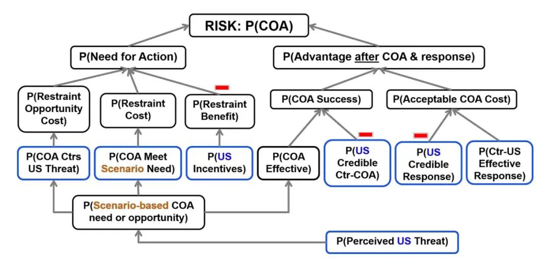 本研究开发的模型不是主要关注对手对所考虑的针对美国的行动方案的成本-收益决策计算,而是将对手针对美国重要利益和生存利益的战略风险分解为两个以克制为中心的因果因素。对手认为有必要采取行动的概率,以及对手评估其因执行所考虑的行动方案而相对于美国具有优势的概率,即使在美国做出反应之后。以下为模型图:
