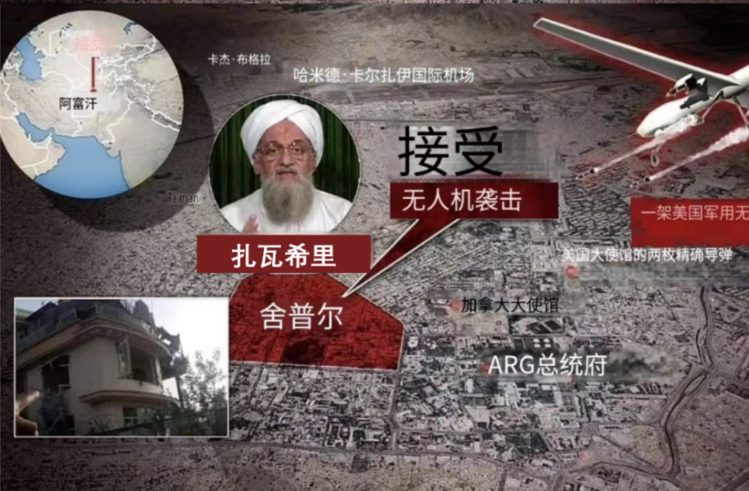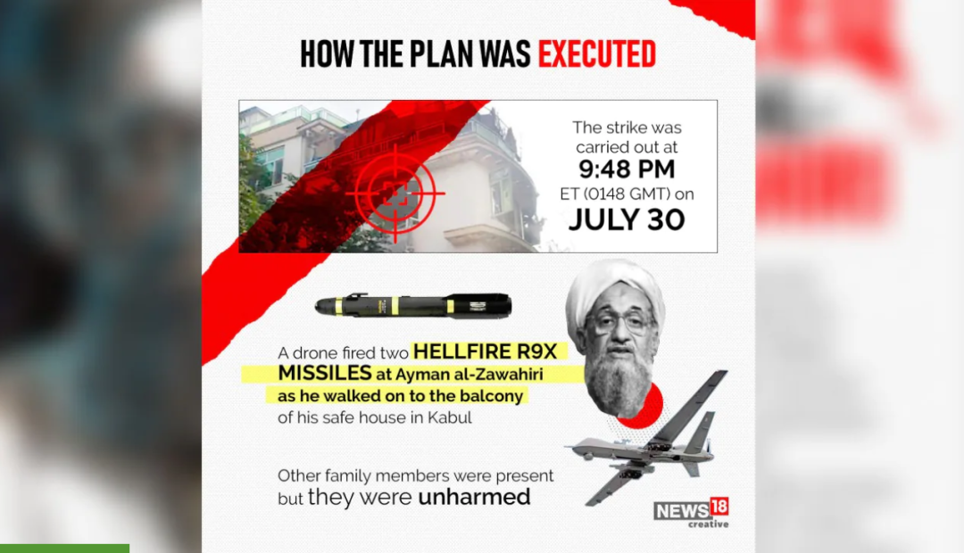 2022年7月31日星期日,一架由中央情报局操作的遥控飞机向阿富汗喀布尔的一所房屋发射了两枚地狱火导弹。袭击的唯一受害者被证实是基地组织埃米尔艾曼·扎瓦希里(Ayman al-Zawahiri),他与家人一起住在距离前美国驻阿富汗大使馆约两英里的安全屋中。