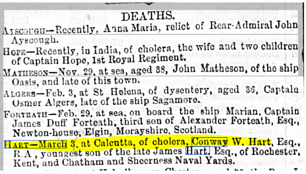 在1864年4月25日的《阿尔比恩报》中,康威·W·哈特(Conway W. Hart)的讣告指出,他于当年3月3日死于霍乱。