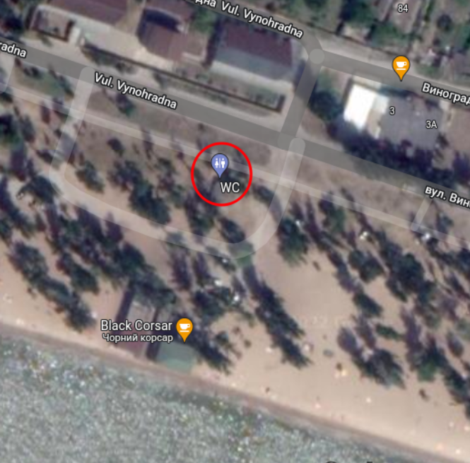 在这里看到了什么?海滩旁的一些结构,上面有一个符号,表示咖啡馆,大量的树木,道路前没有树木的区域,当然还有黑海。
