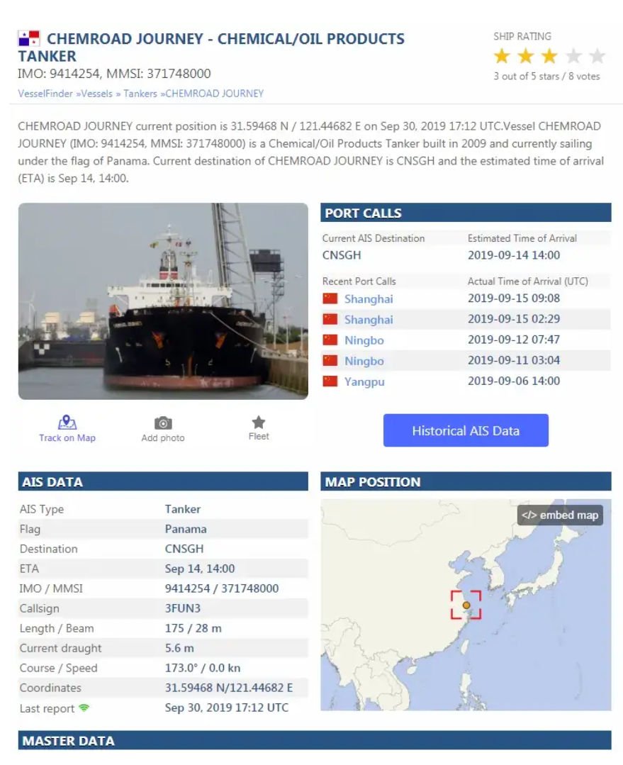 网站上还包括一个航行时间表,显示这艘特定船只到目前为止的旅行。这对于根据以前的目击事件验证您是否拥有正确的船只特别有用。