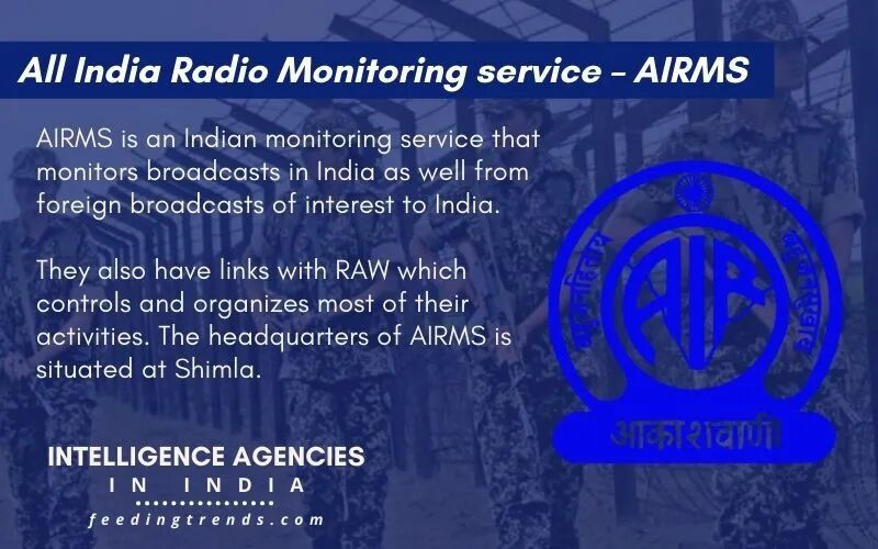 AIRMS是一项印度监测服务,负责监测印度的广播以及印度感兴趣的外国广播。他们还与RAW有联系,RAW控制和组织他们的大部分活动。AIRMS的总部位于西姆拉。