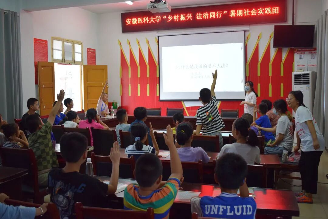 实践团成员分别来到合肥市肥西县铭传乡聚星社区和滁州市定远县定城镇新时代文明实践所,开展普法宣传以及防溺水教育,帮助小学生树立法律意识和安全意识,培养法治思想,培育法治精神。活动中,实践团通过播放法律科普短视频潜移默化地引出“宪法是国家的根本大法”的主题,队员们相继介绍了公民权利和义务、国家机关、我国宪法发展历程等内容。“作为一名法学生有机会践行社会主义核心价值观、投身于中国特色社会主义法治实践我感到很荣幸,希望通过普法的活动让更多的人认识了解宪法,尊重践行宪法。”普法志愿者陶颖说道。实践团还有针对性地开展了以“珍爱生命,远离未知水域”为主题的防溺水安全教育小课堂活动,普及防溺水知识和相关自救措施,提高小学生自我保护意识。