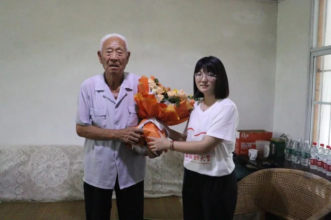 八一建军节前夕,实践团先后前往革命老区,亲切慰问郑贤君和柴万堂两位军休干部,详细了解了两位老人的身体情况以及生活近况,利用自己的专业知识提出针对性的营养膳食建议,并向老人们献上节日的慰问。老人们对实践团的到来感到欣慰,向队员们分享了解放战争和抗美援朝战争中战火纷飞的峥嵘岁月,勉励青年一代要珍惜现在来之不易的美好生活,坚定不移听党话、跟党走。队员们认真聆听老人们分享的前辈革命故事,深受教育、备受鼓舞,老兵身上不屈的民族意志和勇于担当的崇高精神永远激励他们前行。