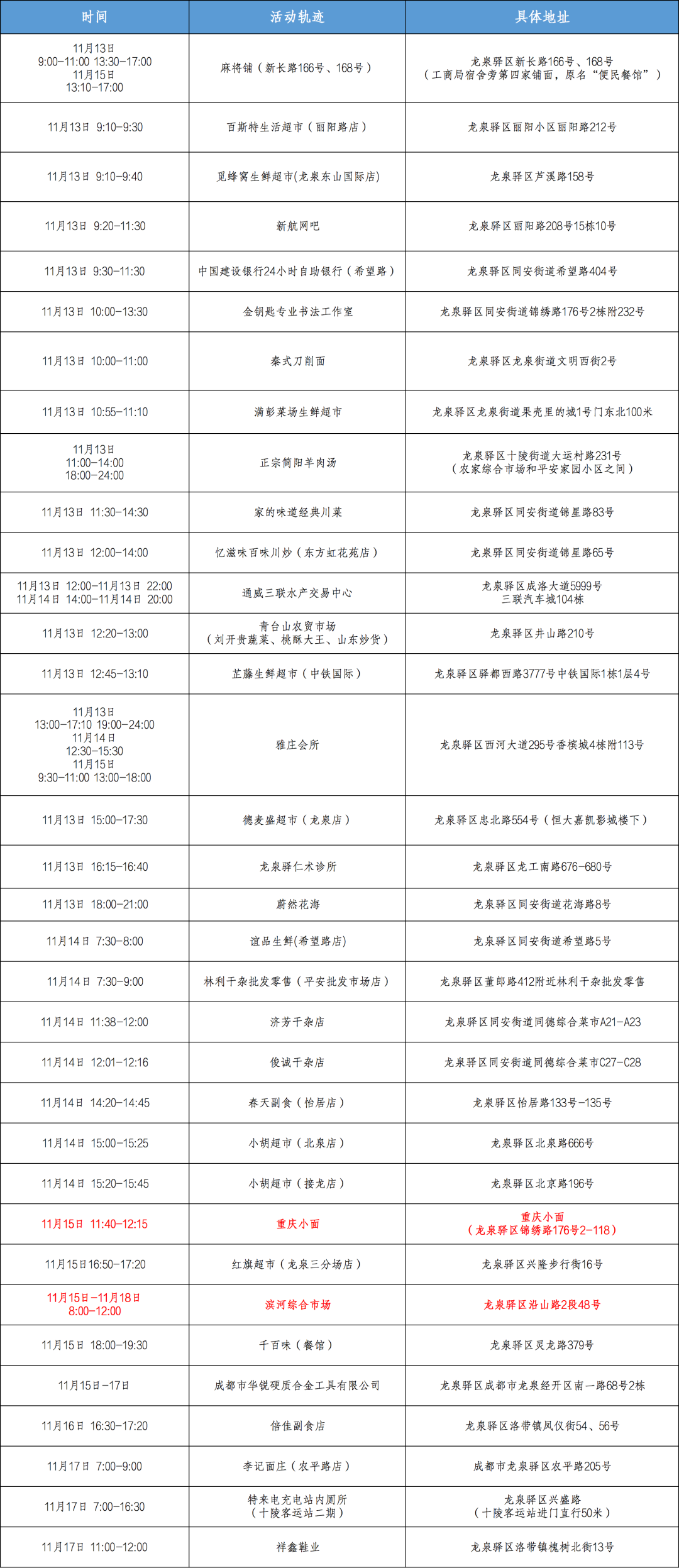因疫情防控需要,请与以下时间和空间有重叠人员,立即向所在社区(村)、单位(或居住的酒店)等主动报备,三天内接受三次核酸检测(间隔24小时),期间做好个人防护,不聚会、不聚餐(第一次核酸检测结果出具前不外出)。(以下活动轨迹更新至11月19日24时)