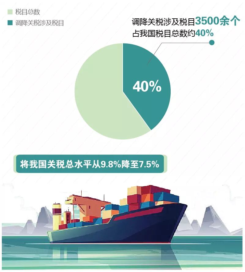 在坚定不移扩大开放、实施更加积极主动开放战略的宏观政策形势下,2018年我国对进出口环节税进行了多轮下调,调降关税涉及税目3500余个,占我国税目总数约40%,将我国关税总水平从9.8%降至7.5%。