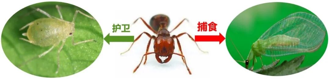 红火蚁特别喜欢吃蚜虫产生的“蜜露”(蚜虫便便),常用触角拍打蚜虫的背部,促使蚜虫分泌蜜露,所以呀,红火蚁常常保护蚜虫,给蚜虫创造良好的取食环境。同时,红火蚁还可以帮助蚜虫杀伤其天敌,如草蛉。这都会对植物造成间接危害。