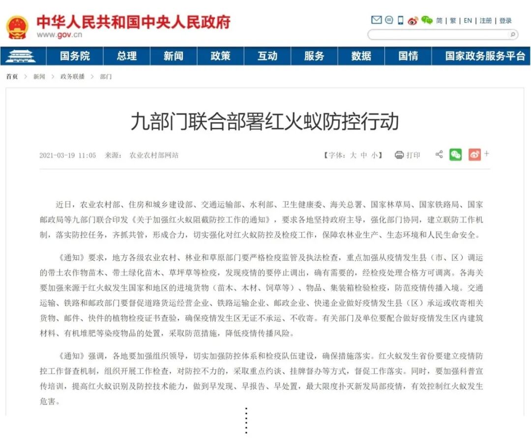 红火蚁是全国农业、林业和进境植物检疫性有害生物,也是全球公认的百种最具危险入侵物种之一,取食农林作物种子、果实及根系,筑巢引起电线短路或设施故障,叮蛰人畜造成灼伤疼痛甚至休克和死亡,在城市公园绿地、农田、林地、江河堤坝,以及城乡垃圾场、撂荒地都有分布。