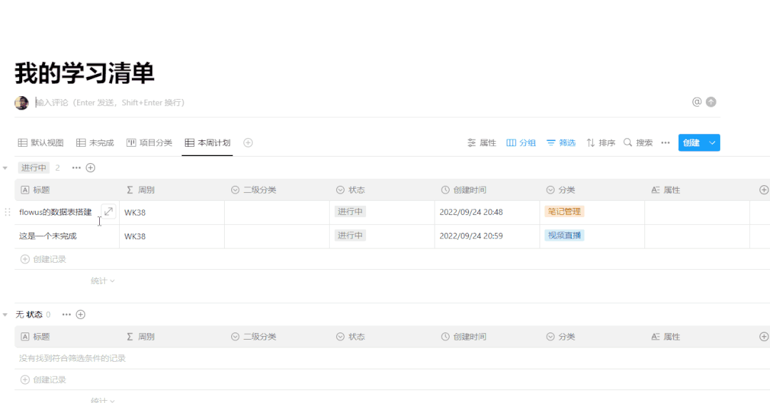 而flowus因为支持【标题】功能,我们可以把这个表格理解成一个【笔记管理】的“清单”,在表格中标记笔记的各种状态、属性,更高效的管理笔记。
