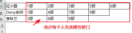 然后再统计每个人,负责那几个部门?