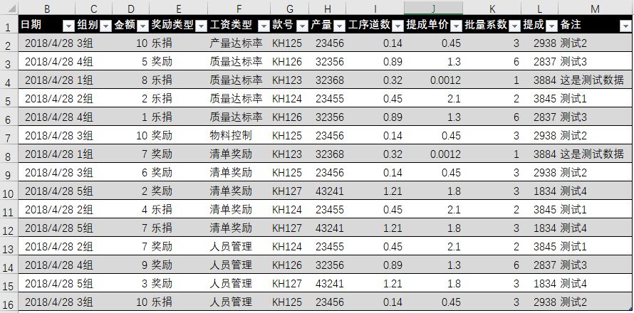 对应的数据表中,会出现一个“工资类型”的列,记录工资的类型,也就是输入表中的“产量达标率,质量达标率,物料控制”等等。