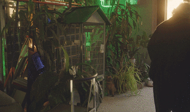 来到维戈在米兰的公寓,你会发现她自己家就是一个大型创作现场。很难想象一位目前已年逾八旬的老人住在充满霓虹灯管和“迷幻”灯光的环境中。氤氲的镜头里,茂密的热带植物、给各种动物准备的笼子、闪烁着红蓝粉绿光的灯管、将光线折射出无数彩虹的工业玻璃和镜子,影片传来复古的电子背景乐,你好像来到了上世纪60年代安东尼奥尼彩色电影中的片场,不自觉地开始思考每个镜头、每种颜色的玄奥内涵。