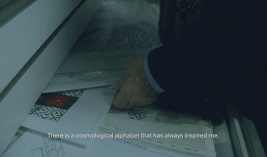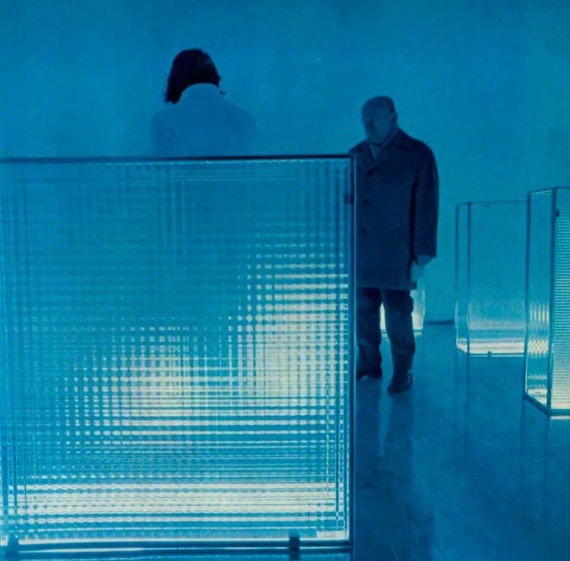 一头银发的维戈在自己的杂乱的工作台上翻阅着遍布几何图形的草图,一边解释着自己的创作理念。“光线对于构造物体、营造氛围来说是至关重要的,光线既有维度又没有维度,这让它可以走得很远。”维戈自述。她的脖子上披着反射着银光的新款路易威登围巾,很是应景。镜头里墙上的一张珍贵照片的影像滑过,那是1969年,年轻的维戈从冯塔纳背后亲密地搂着他的脖子。