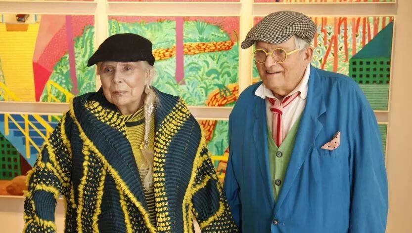 如今,80岁的霍克尼仍然是时髦可爱的,经常看到穿着休闲裤配着可爱的纽扣、明亮的针织和色彩缤纷的领带还有他标志性的平顶帽,谁又能拒绝这位时髦的英式老头儿呢?