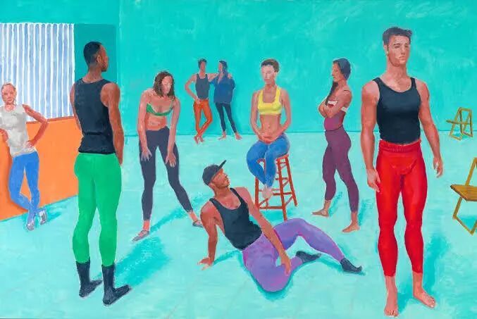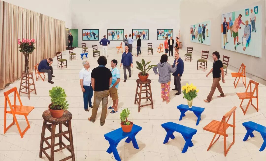 2014年,大卫·霍克尼开始在工作室中绘制以一群人为模特作画。相比于照片定格瞬间的形式,霍克尼认为作画者将自身置于创作环境中,以眼睛为视角定格出的每一个瞬间都是不一样的,因此他的群体画像从某种意义上来说是变化的。