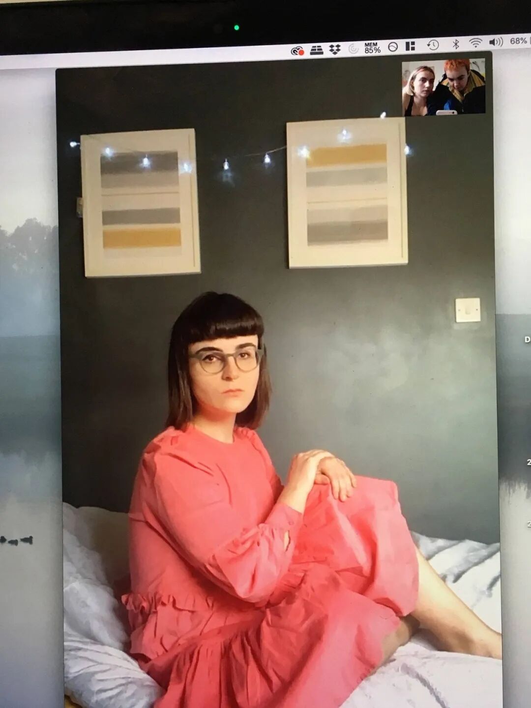 最后的成片里,Alice 坐在床上,面无表情地盯着镜头,但其中似乎还有着一种微妙的幽默。Glazzard 故意让自己的桌面背景显示在相片的边缘:在右上角,FaceTime 的显示框里,一个小方块显示出 Glazzard 的身影,她留着亮橙色的短发,身旁是女友和合作伙伴 Nora。
