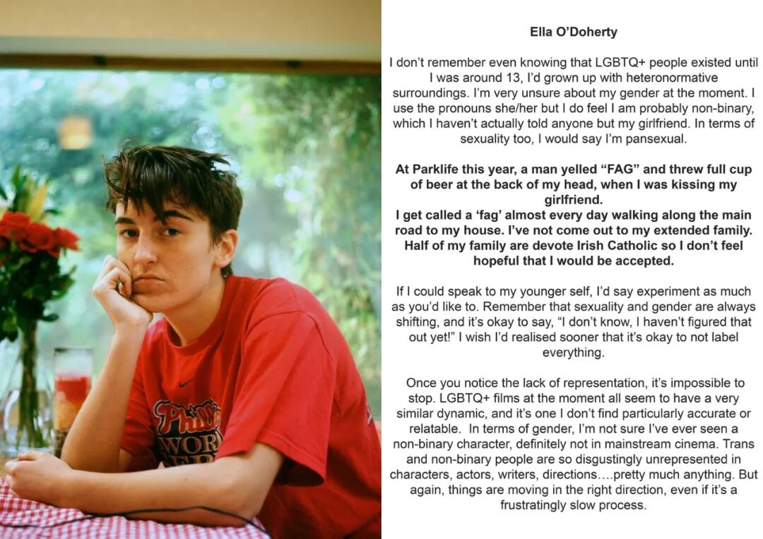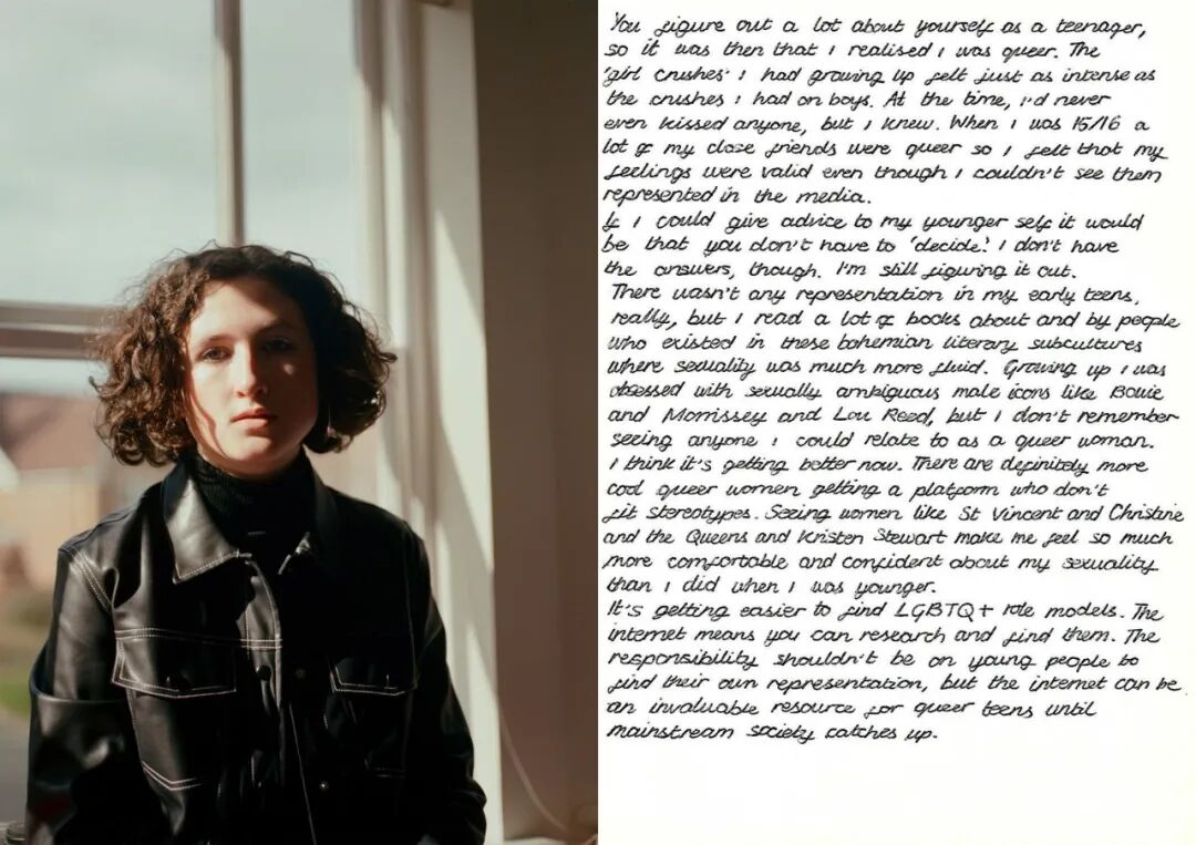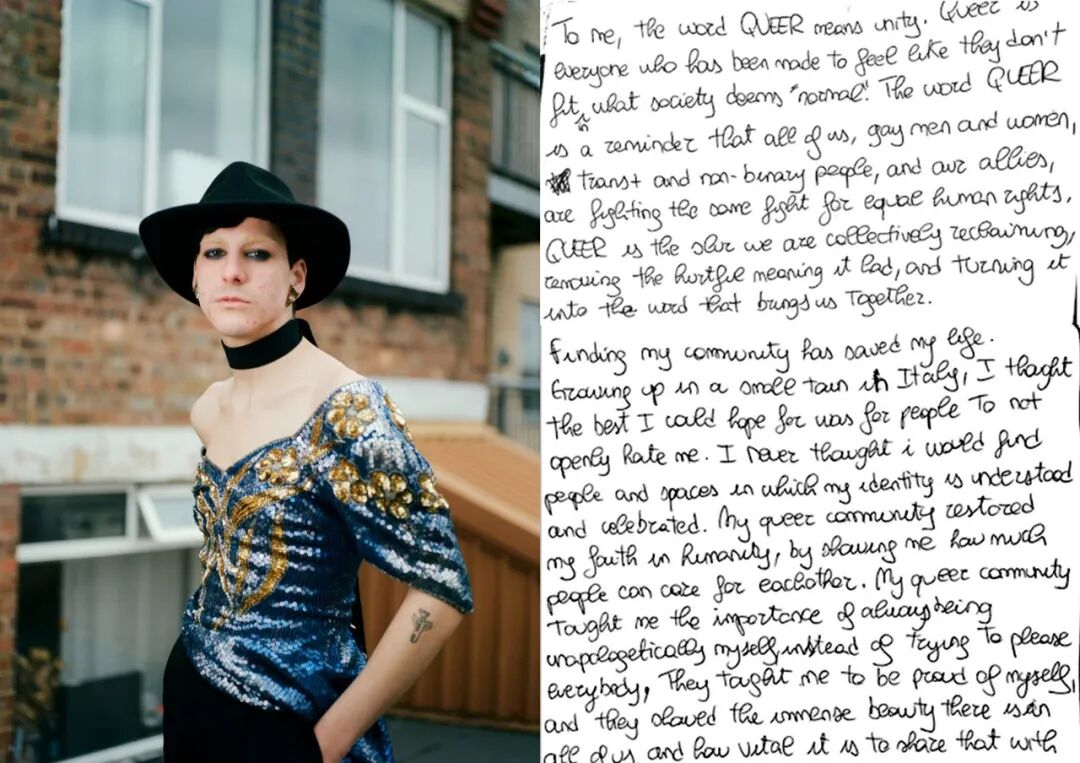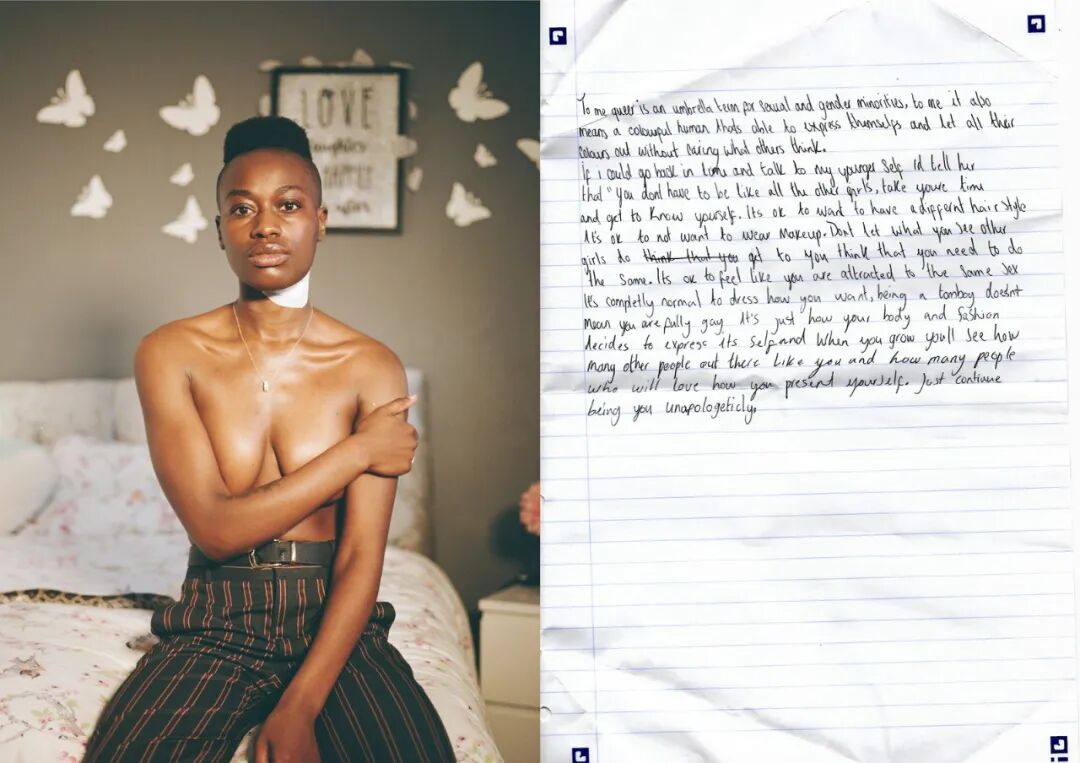 照片旁边还有他们写给以前的自己或回答问题的手写信,比如:身为酷儿对你意味着什么?被拍摄的每个人都与其他人截然不同,这正显示出酷儿群体的多样性。Glazzard 的照片总是传递出个体的特质,这些照片本身是温柔的,被摄者同时也是脆弱的、坦率的。