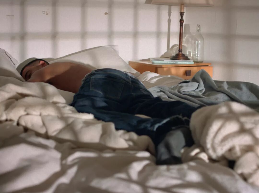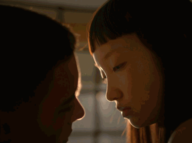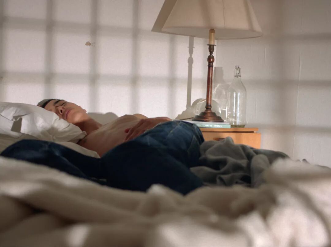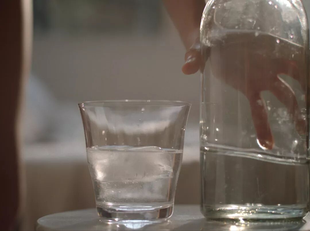 随后,东方面孔的女主角出现,缓缓走向仍然沉睡的男子。桌子上的冰水和男子赤裸的身体暗示着夏日的温度。