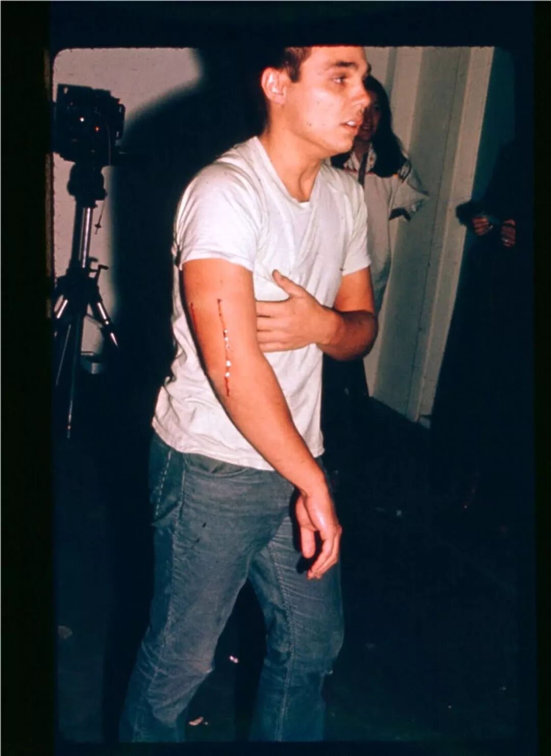 1971年11月19日,在加州的 F Space 画廊,25岁的 Chris Burden 站在墙壁前面,面对着手持枪杆的朋友。“准备好了吗?”,Burden 点头示意,随即朋友朝着他的手臂开了一枪。
