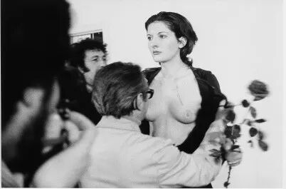 类似地,马丽娜•阿布拉莫维奇在1974年的《Rhythm 0》中,坐在摆满了各种道具(包括鞭子、刀、蜡烛等)的桌子前,让观众对她身体做任何事情且自己不做任何反抗。观众同样从试探性地“温柔”行为发展成真实地用刀划破她的身体。