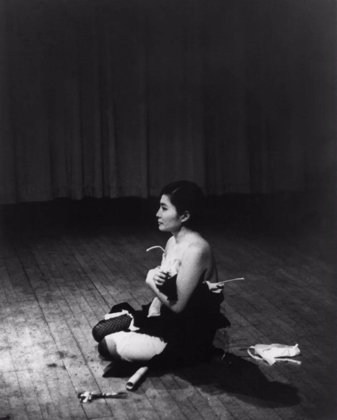 1965年,小野洋子的行为艺术作品《Cut Piece》中,她跪坐在地,前面放着一把剪刀,让现场观众随意剪碎她的衣服。观众从害羞到最后疯狂剪掉她的衣服只剩底裤,其中激发出来的现象值得每一个剪掉她衣服的观众和旁观者思考。