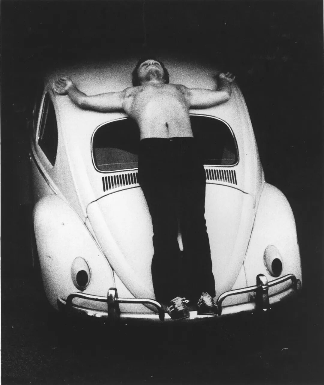 1974年,他躺在一辆大众甲壳虫车的引擎盖上,双手被钉在上面,宛如耶稣受难。车子从车库开出,引擎发动2分钟之后倒退了回去。