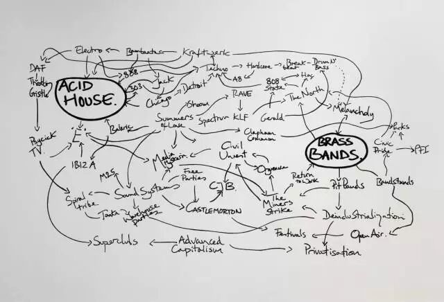 这种热情也成就了他最广为人知的作品《The History of the World, 1998》,在这个思维导图之中,我们能够观察到,他是如何把 acid house (酸性浩室音乐)和 brass band (铜管乐队)联系在一起的。