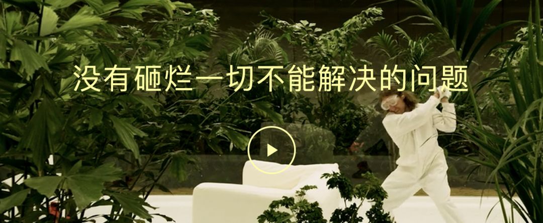影片《花园》,记录了道格·艾特肯的宣泄现场。位于漆黑仓库的花园中,有一片在人工植物生长灯下的茂盛丛林,同时还原了现代家居中的家具,观众进入房间,可以随意摧毁里面的一切。