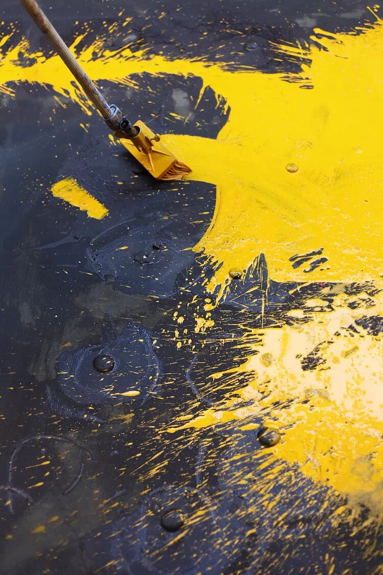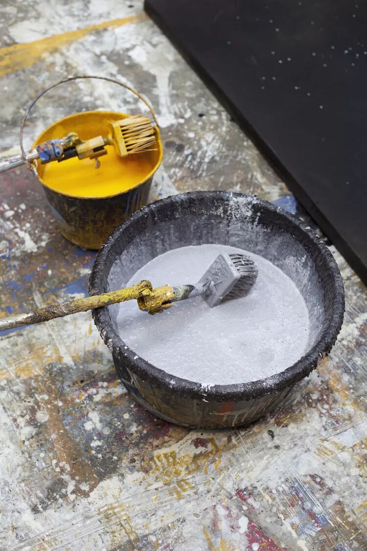 塔克西埃将研磨而成的矿物颜料倾倒入水中加以搅拌,就像童年记忆里沼泽中的那两罐牛奶一样,然后用一把巨大的刷子蘸取混合物,在画布上涂抹挥洒。塔克西埃的创作过程就是他处理“存在”本身的谜团的过程。